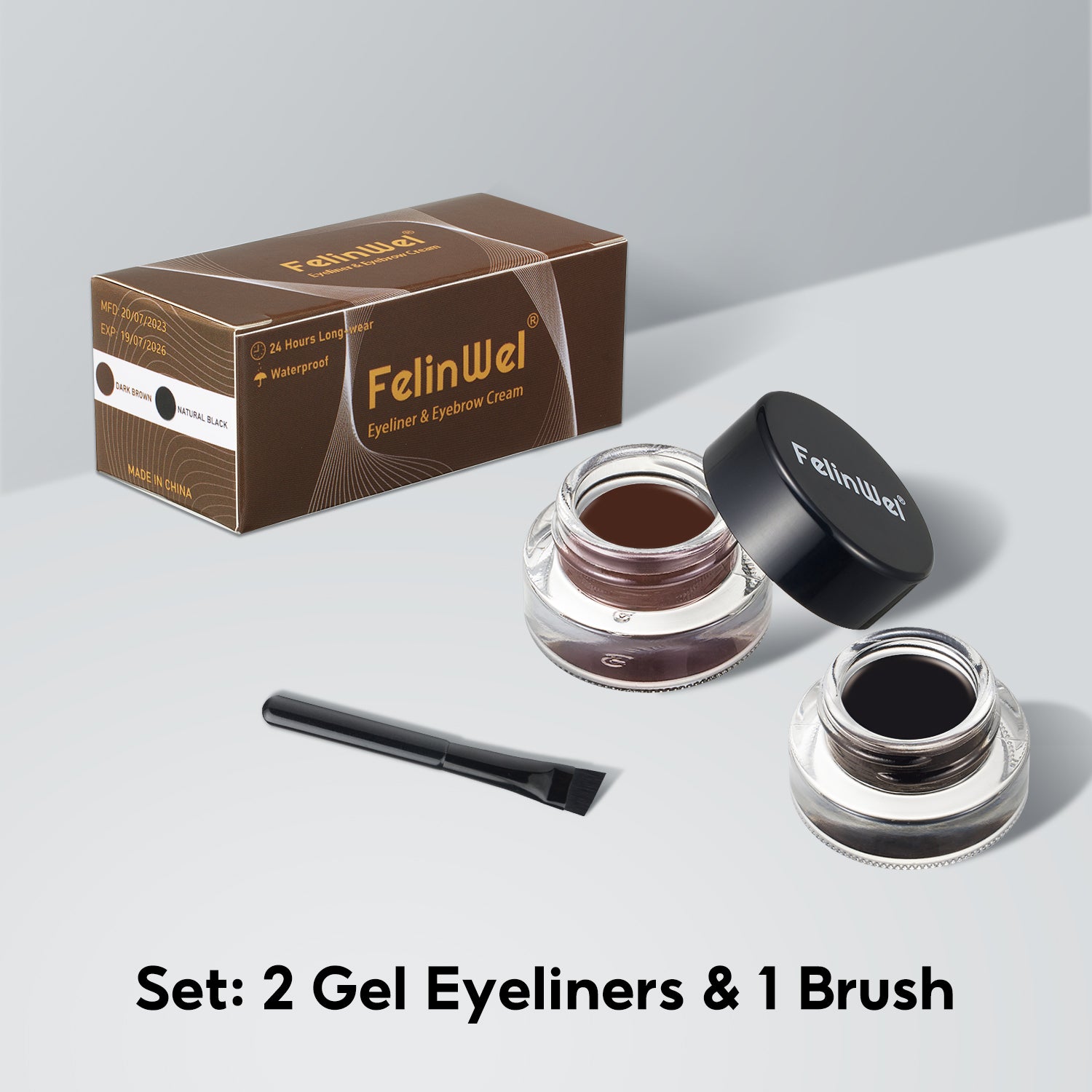 FelinWel Juego de delineador de ojos y cejas en gel de 2 colores con 2 pinceles impermeables a prueba de manchas